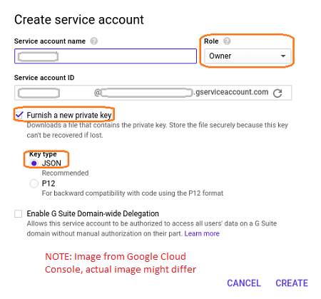 • Service Account Id: You will get this when creating a Service account. This account should have Role set to Owner and Key Type as JSON (see here on how to obtain it)
