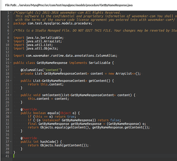 For all queries and procedures, there will be a Rest API generated with the Service layer. Along with the API, depending on the query or procedure type, request and response POJO classes are generated.