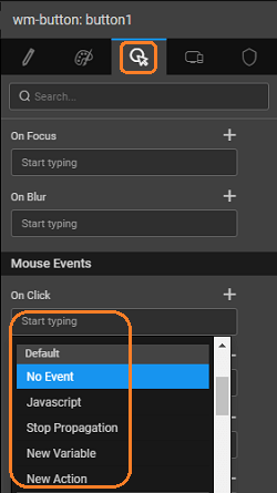 Events provide a way for you to define the actions that take place when something occurs in your application. There are many events that occur within a WaveMaker application. The most common events are user interface events, such as when a user clicks a button. Events are also triggered when an editor's value changes, and even when a Variable gets new data from the server. You have several options for specifying what will happen when a button is clicked.