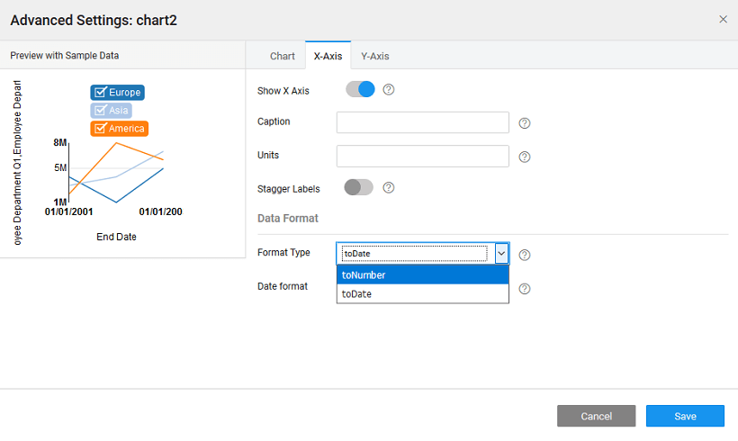 In the case, when the data source is from Web Services or Web Socket, you can choose the Format Type to be toDate or toNumber.