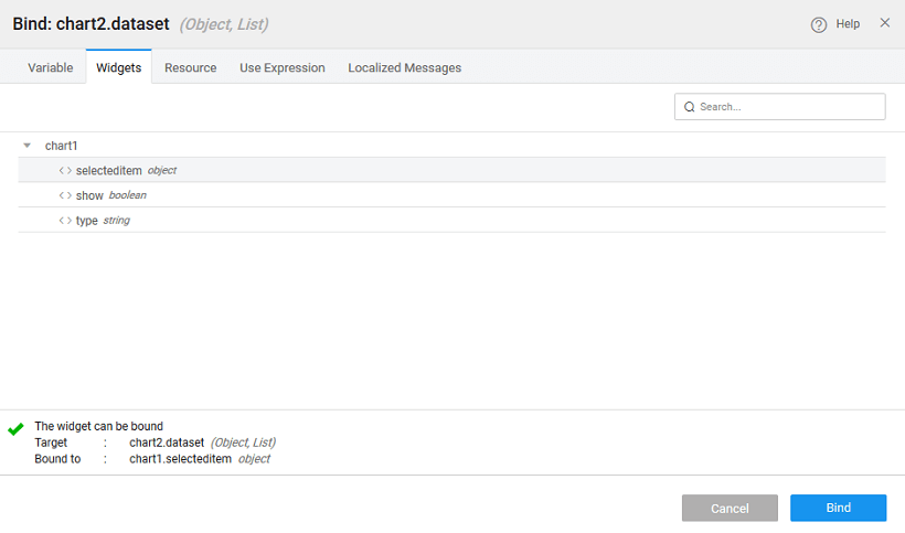 • These data points can be captured and used to bind to a widget for further display or computational purposes from the selected item of the chart widget