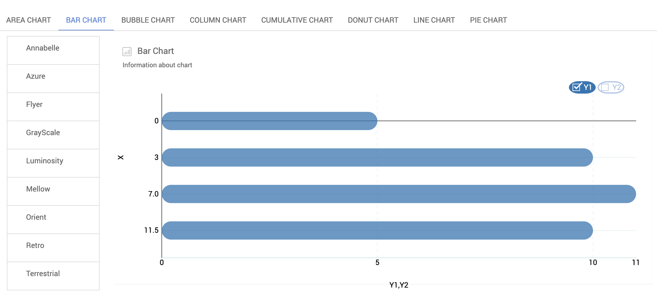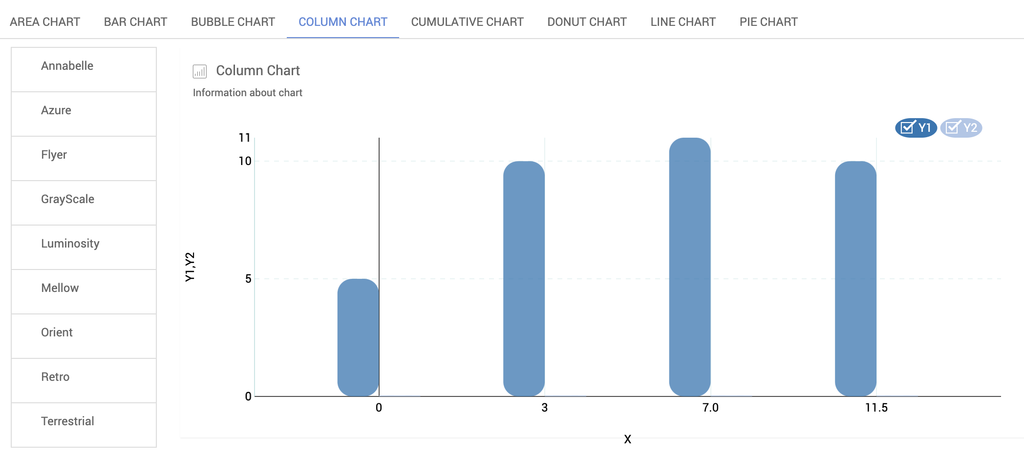 • The theme for charts can be chosen from a list of options.