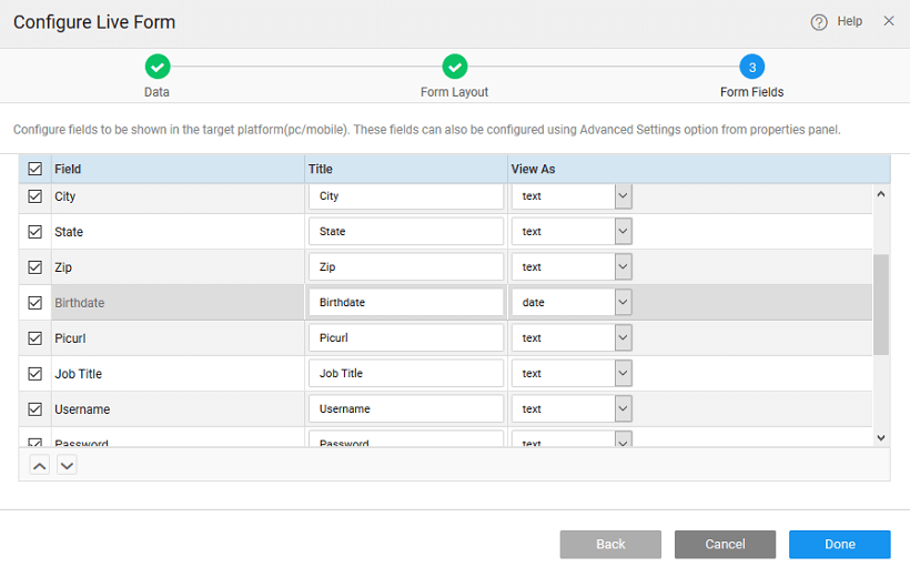 - Select the fields to be available for the user to interact with. All the fields from the selected data source will be presented for selection.