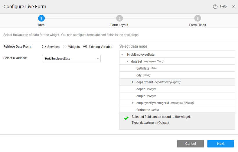 There can be different scenarios to deal with when configuring your Live Form Widget with a data source. The data source can be in the form of database CRUD variables or from an another widget, usually Data Table, on the page.