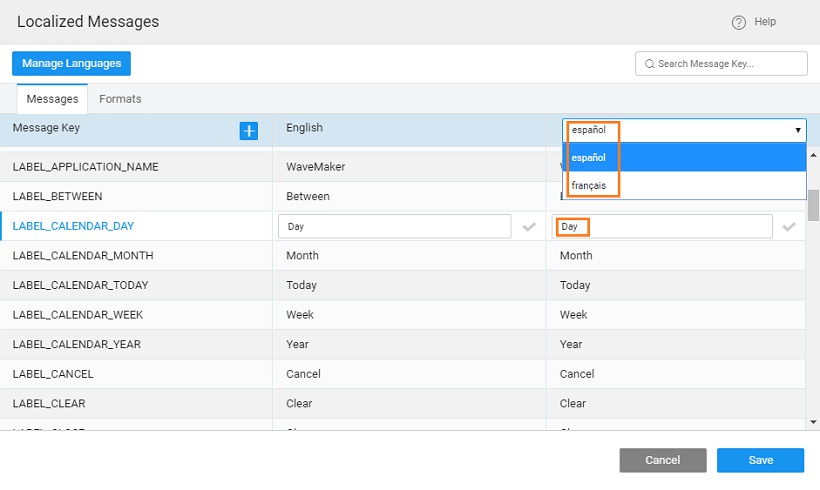 2. When the user selects a Language on your application or when you set the default language of the app from the Project Settings dialog, WaveMaker applies the relevant locale settings to show the messages as per its value for that locale.
