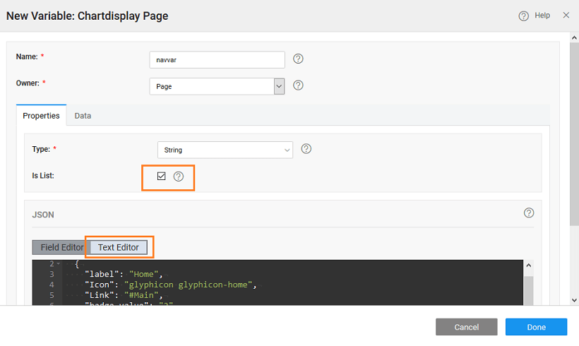 - Create a new Model Variable called as navvar and select isList.