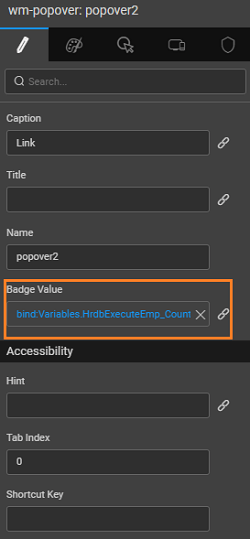 - Set the content source property to the partial and the content as popover page created in the previous step and bind the badge value to the Emp_Count value. Content defines the page to be displayed when the popover link is clicked and badge indicates the number of items that will be displayed in the content.