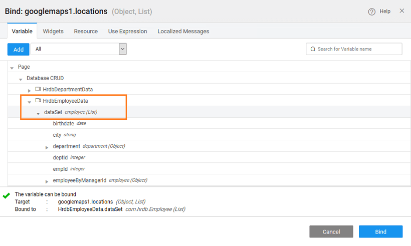2. Bind the Locations property to a database which contains the address fields. Here we are using HrdbEmployeeData table from the imported Sample DB. screenshot