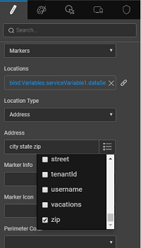 • Address wherein the Address fields in the form of a city, state, zip etc can be picked from the multi-list dropdown. These are the fields from the variable bound to the Locations property above.