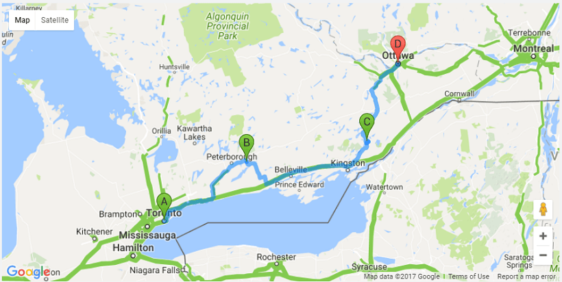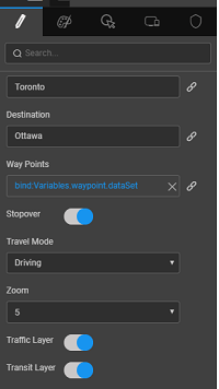 • Set the Origin and Destination to Toronto and Ottawa, and bind the Waypoint to the model variable created in the previous step. Selecting the Stopover property will mark the waypoint. Screenshot