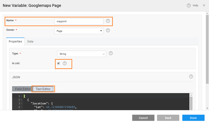 2. Create a custom variable as per your requirements. Know more from here. Then enable the isList property, and enter the appropriate JSON in the Text Editor. screenshot As an example you can use the following: