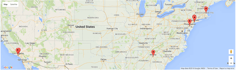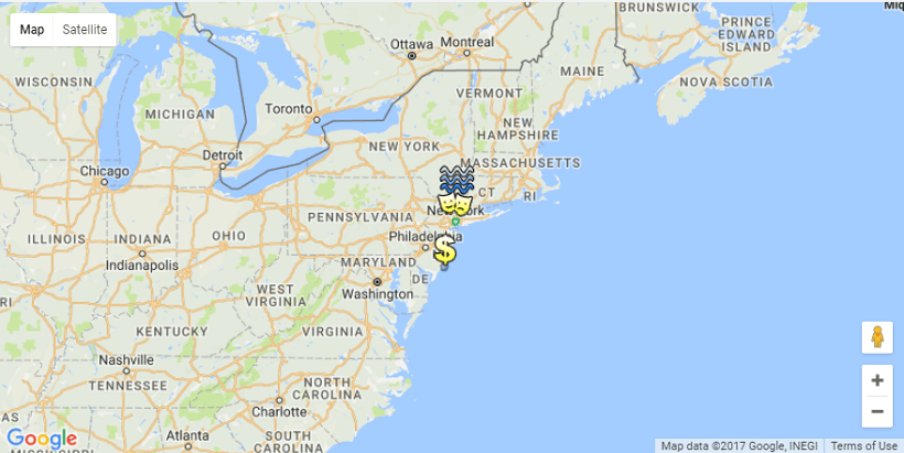 • You will see the google map displayed with the cities mentioned in the static variable highlighted with the appropriate icon and information tags. You can zoom in, zoom out, pan left, right, top and bottom as you would with google maps. screenshot