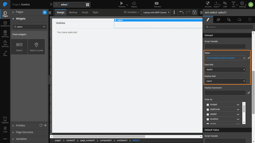 - Set the Datafield property to the deptid field and Display Field property to the name field of the Live Variable corresponding to Department dataset