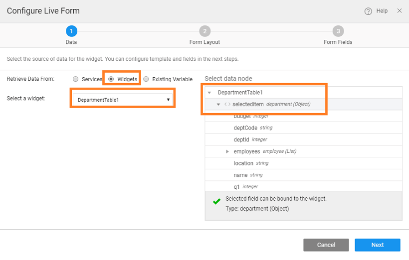 To use form for updating the table, it needs to be bound to a Data Table or a List widget's Selected row property. Here we will see linking Data Table to a Live Form, the same can be replicated for a List. Another easy way to achieve this would be to use the Editable Data Table with Live Form layout.