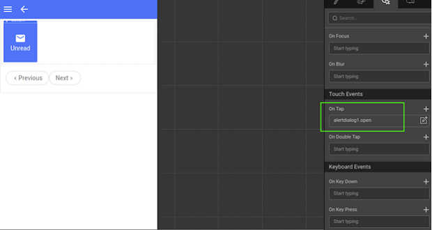 1. Events can be bound on the button. Add an action on-tap event on the button to open an alert dialog.