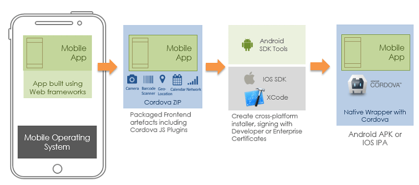 The Build process for a mobile application can be performed through Automated Build process where you can generate .apk (Android application package) or .ipa file (iOS App Store package). Another way is to download Cordova/PhoneGap compatible .zip files to build systems manually for Android/iOS platforms.