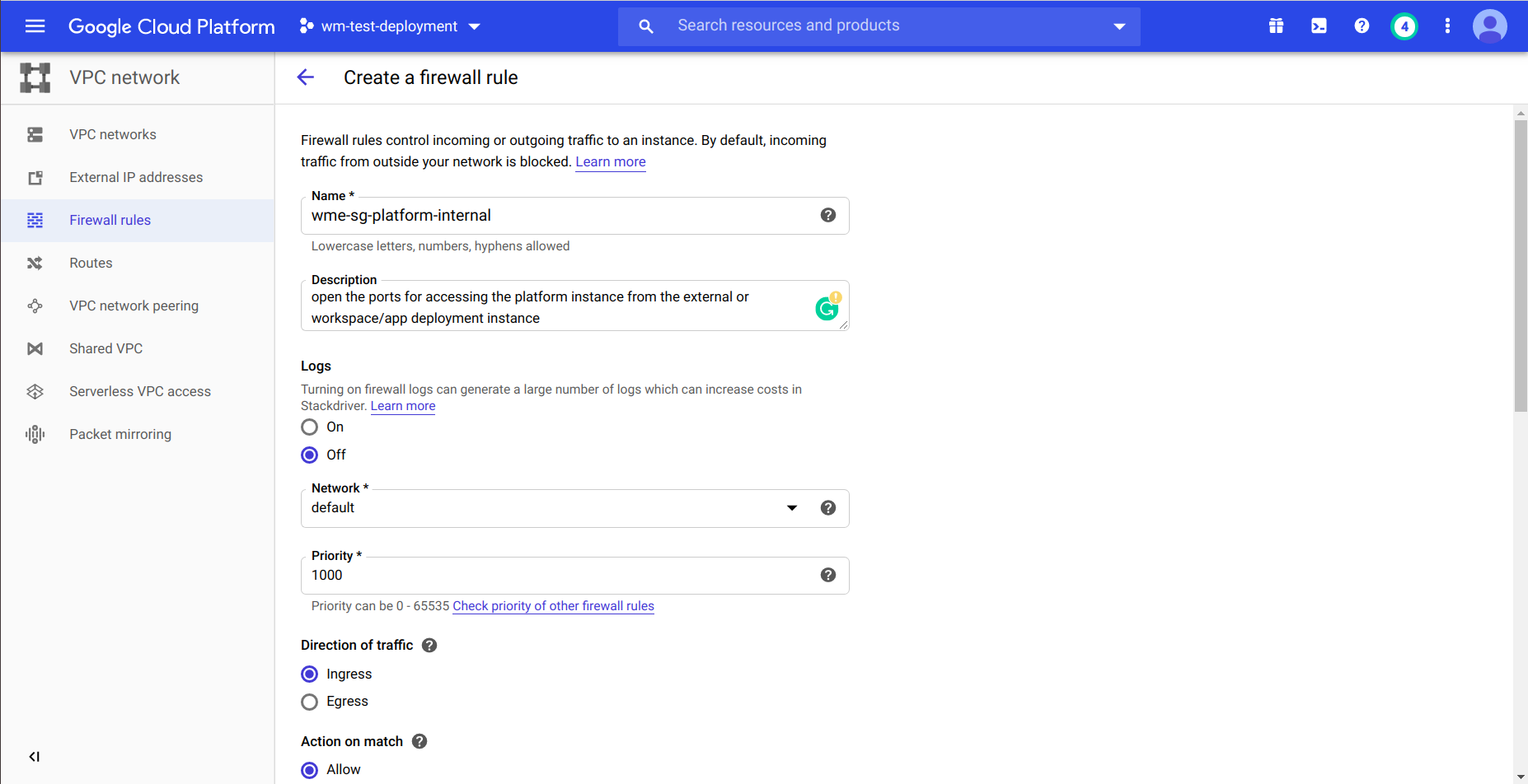 Create a firewall rule for Platform Instance