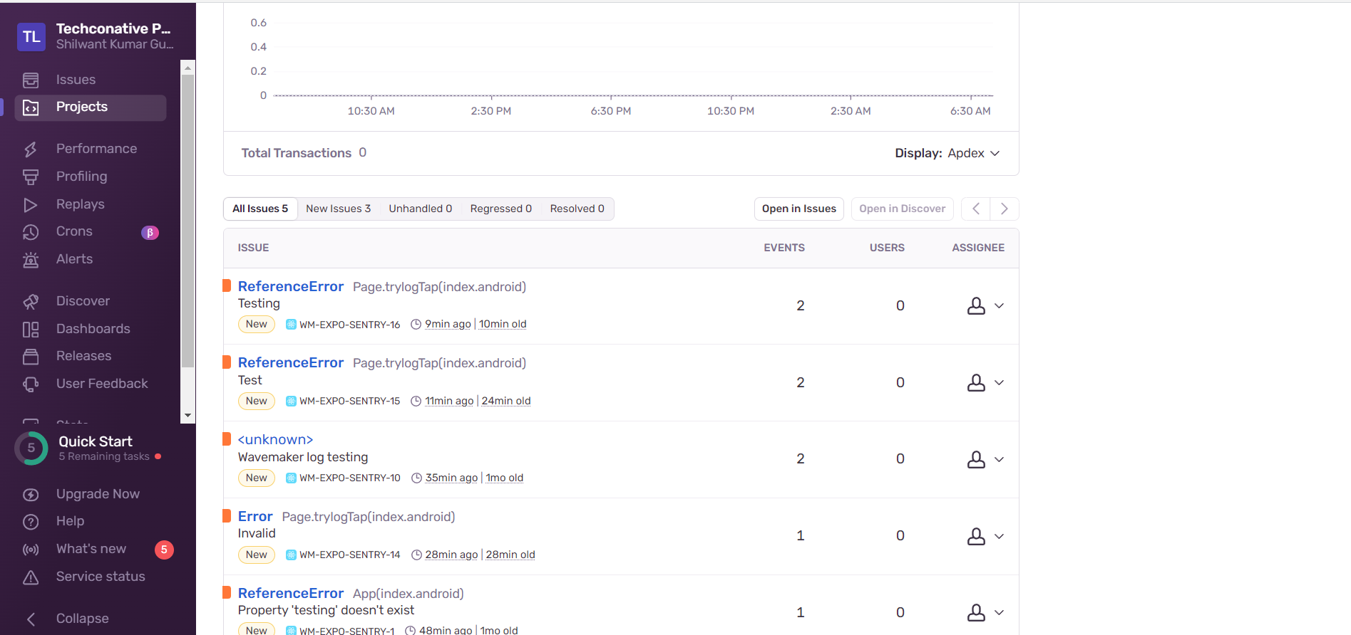 - Once you selected appropriate project, you can see captured errors, exceptions, and crash reports.