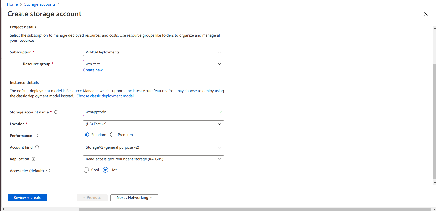 - In the advanced section select blob access and security options, next provide tags for the storage account and review the details and create a storage account.