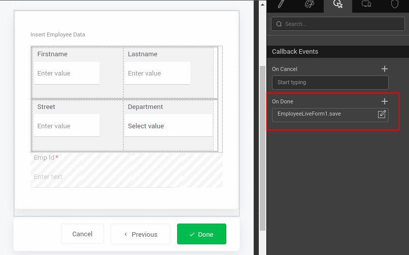- Select the wizard widget and onDone event select save method of the liveform from the dropdown(to save the form on Done button click present on the last step of the widget widget). Check below image for reference.