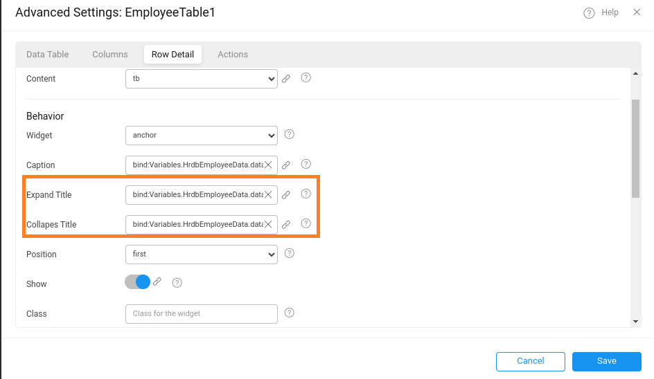 ​In previous versions, when Enable Row Expansion was activated in the Data Table widget, the Collapse Title and Expand Title properties in the Advanced Settings were not bindable; users could only input static text into these fields. With the latest update, these properties can now be dynamically bound to the dataset used in the Data Table, allowing titles to be fetched at runtime.​